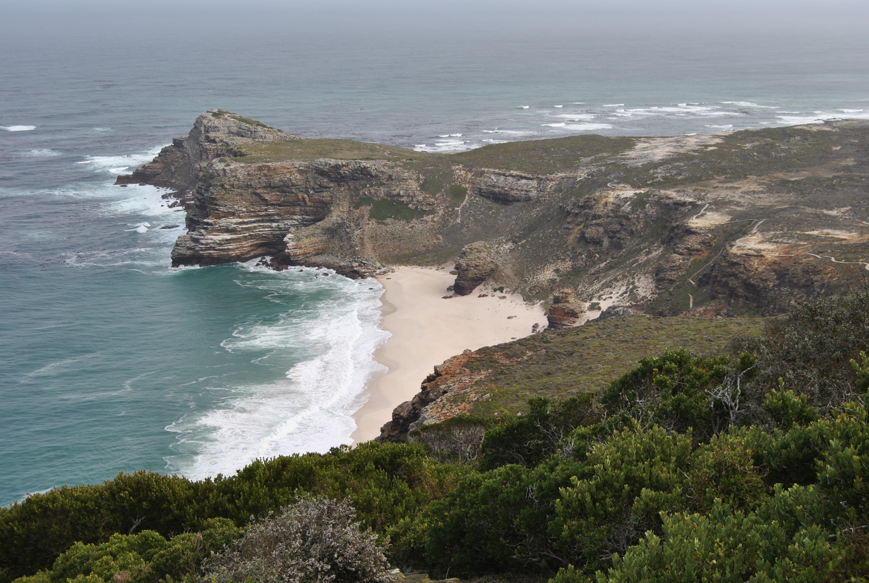 Tuesday saw us driving up to Cape Point, where the two oceans meet. I had never been there, and I certainly never anticipated the beauty of the Table Mountain Nature Reserve that you drive through to see these two mighty seas crash into each other. Raining on the way, but sunshine upon arrival, even if there was a bitter wind, made the vista a picture of more than what a thousand words could possibly explain.