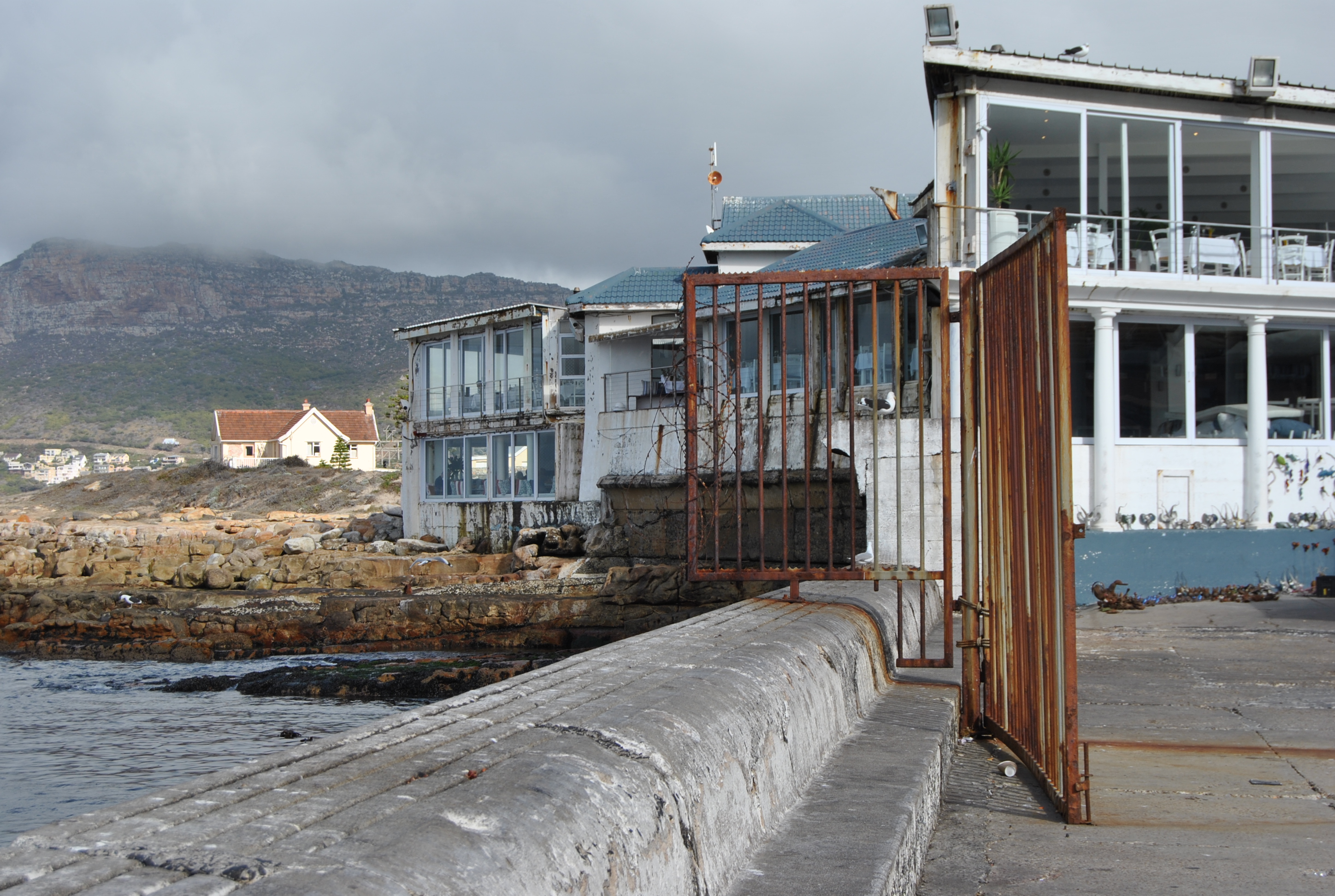 About an hour out of Cape Town, up and past (boring) Hermanus, there is Kleinmond, a small fishing village that has transformed itself over the years. Now boasting home crafts, art, fresh fish, small village living and some fine restaurants. It was here a few years ago we came for lunch and fell in love with its closeness to the sea and rocks and its lack of pretentiousness. So we came back for our official anniversary lunch of Hake, chips and salad, while cowering inside the Boathouse Grill