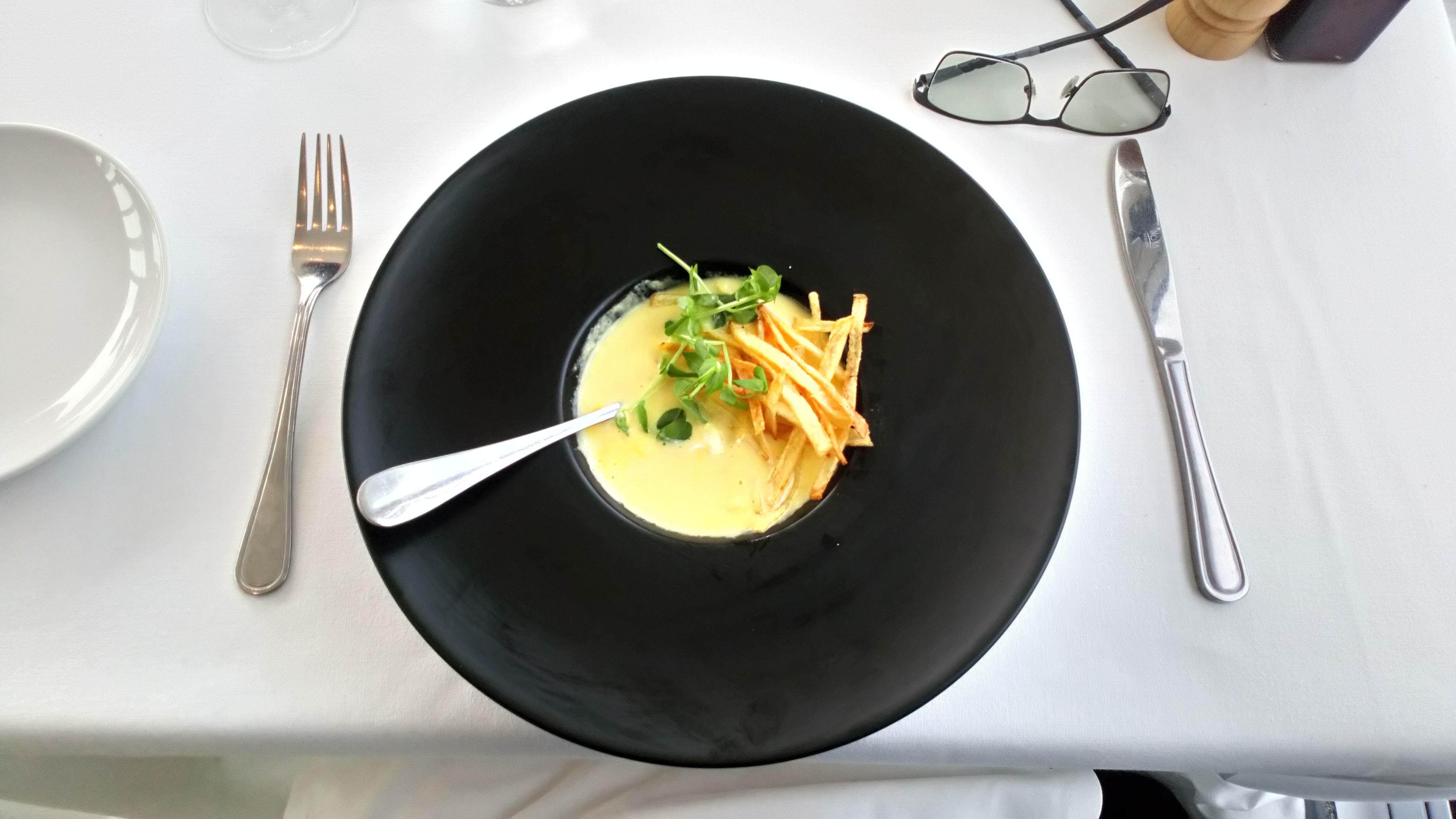 Lunch was a Cream Corn Soup with creme fraiche and chive mousse. Beautifully presented. Small portion. Taste buds left the building on a high and hot on the heels of Elvis.